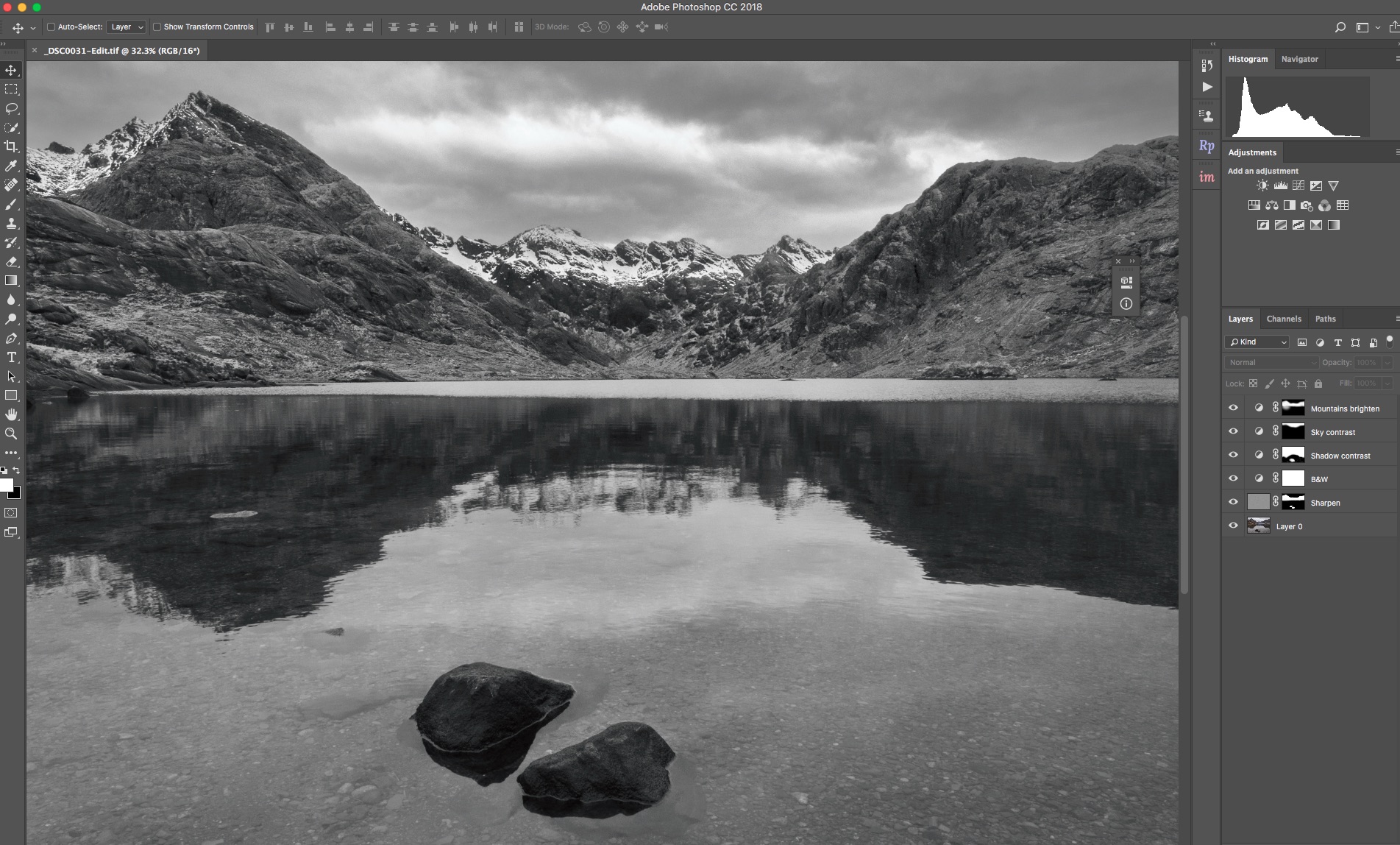 The image above is a tentative step on this journey into tonal interpretation, creating images that reflect how I see the world. I decided to see what would happen with no editing in Lightroom other than lens correction and dropping the highlights to get some definition back in the clouds. It was a gloomy day on the shore of Loch Coruisk in the heart of the Cuillin mountains on the Isle of Skye and I wanted to bring that out, along with the calmness in the loch on the largely windless afternoon of flat light. Using Bruce’s techniques I walked the mounatins again, this time with my curves eye-dropper to see where each part of the landscape fell on the histogram. I wanted contrast and thanks to Bruce’s techniques, I now knew where. After some creative sharpening using the high pass filter with overlay blend mode, the result is at the top of this post. Below is my editing session in Photoshop for the image (click to see a larger version):